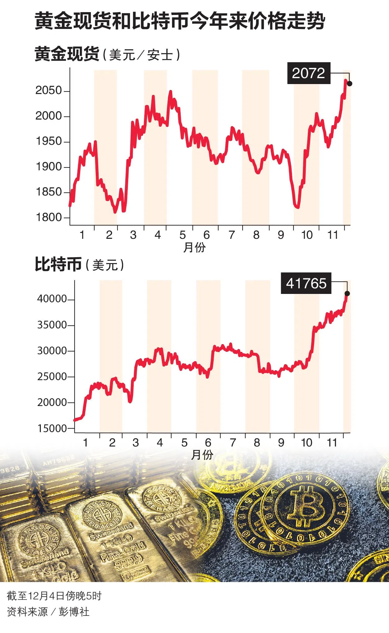 市场押注美国联邦储备局明年即将减息,以及受到其他利好消息的带动,使到黄金价格一度升至历史新高,而加密货币龙头老大——比特币也升至过去19个月最高水平。市场人士预期,这两类资产的升势会延续到2024年。