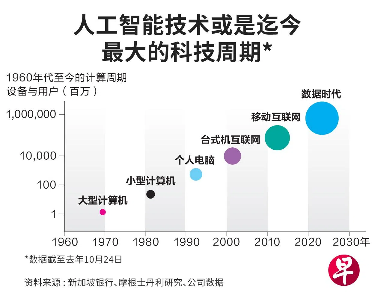 另一方面,人工智能板块也备受看好,尤其是生成式人工智能。报告指出,在过去不同的计算周期,投资者经常低估新技术最终的发展规模。例如,根据1996年的市场预测,全球互联网用户总人数会在2000年达到1亿5200万人。然而,互联网用户实际上增长到3亿6100万人。
