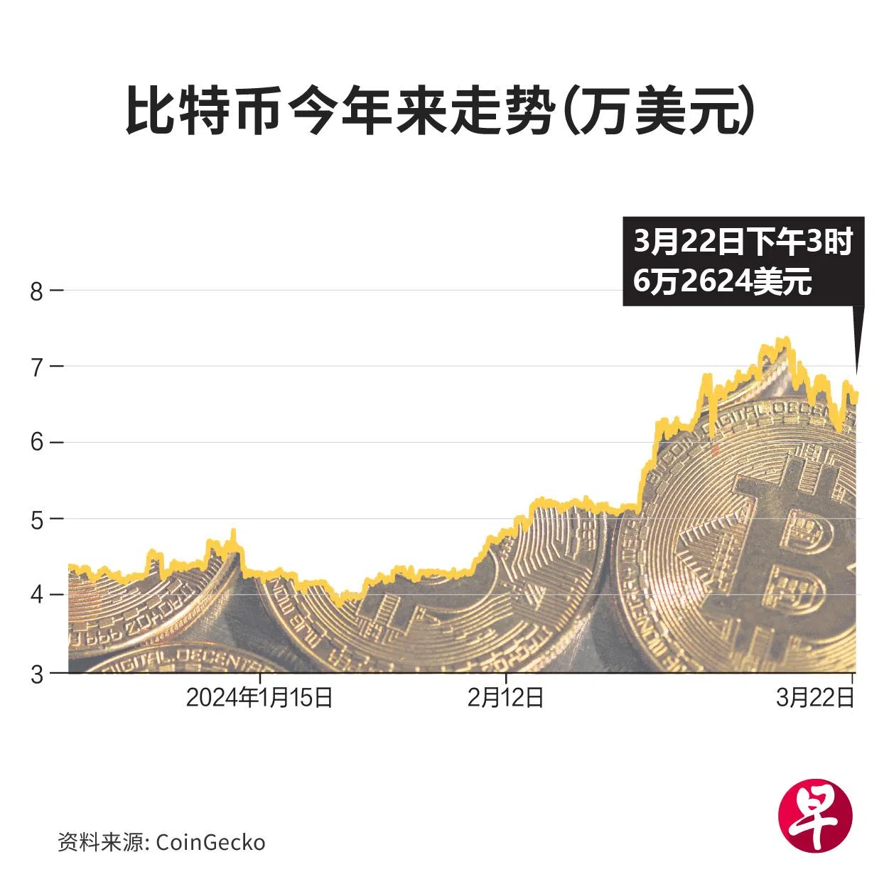 比特币上星期四(3月14日)攀上历史高峰7万3737美元(9万8853新元),不到一周就回吐涨幅及跌破7万美元关头,一度下探至6万1494美元,星期五(22日)稍微收复失地,回升至近6万6000美元。