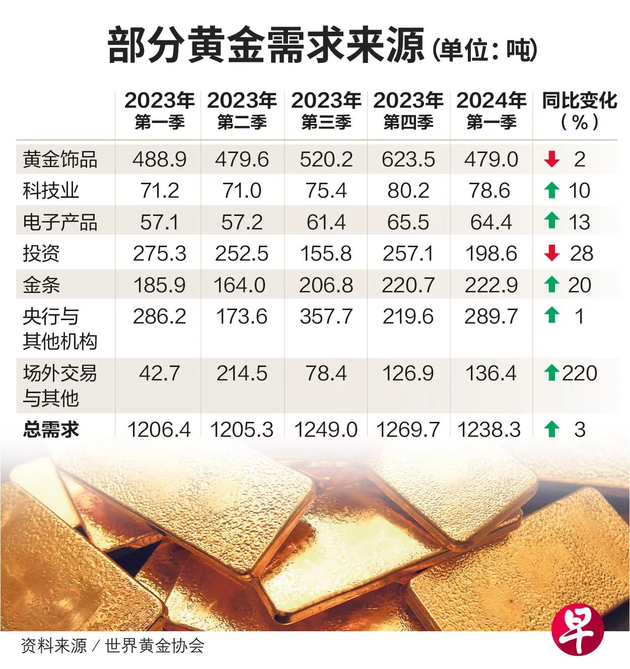 今年第一季黄金需求增加3%至1238吨,是2016年以来最强劲的第一季。这也带动金价创新高,第一季平均每安士2070美元,同比上涨10%。