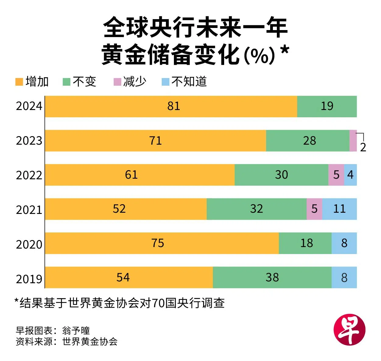 一项调查显示,近三成央行预计未来一年继续增加黄金储备,反映在金价高企的背景下,不少央行仍持续看好黄金。