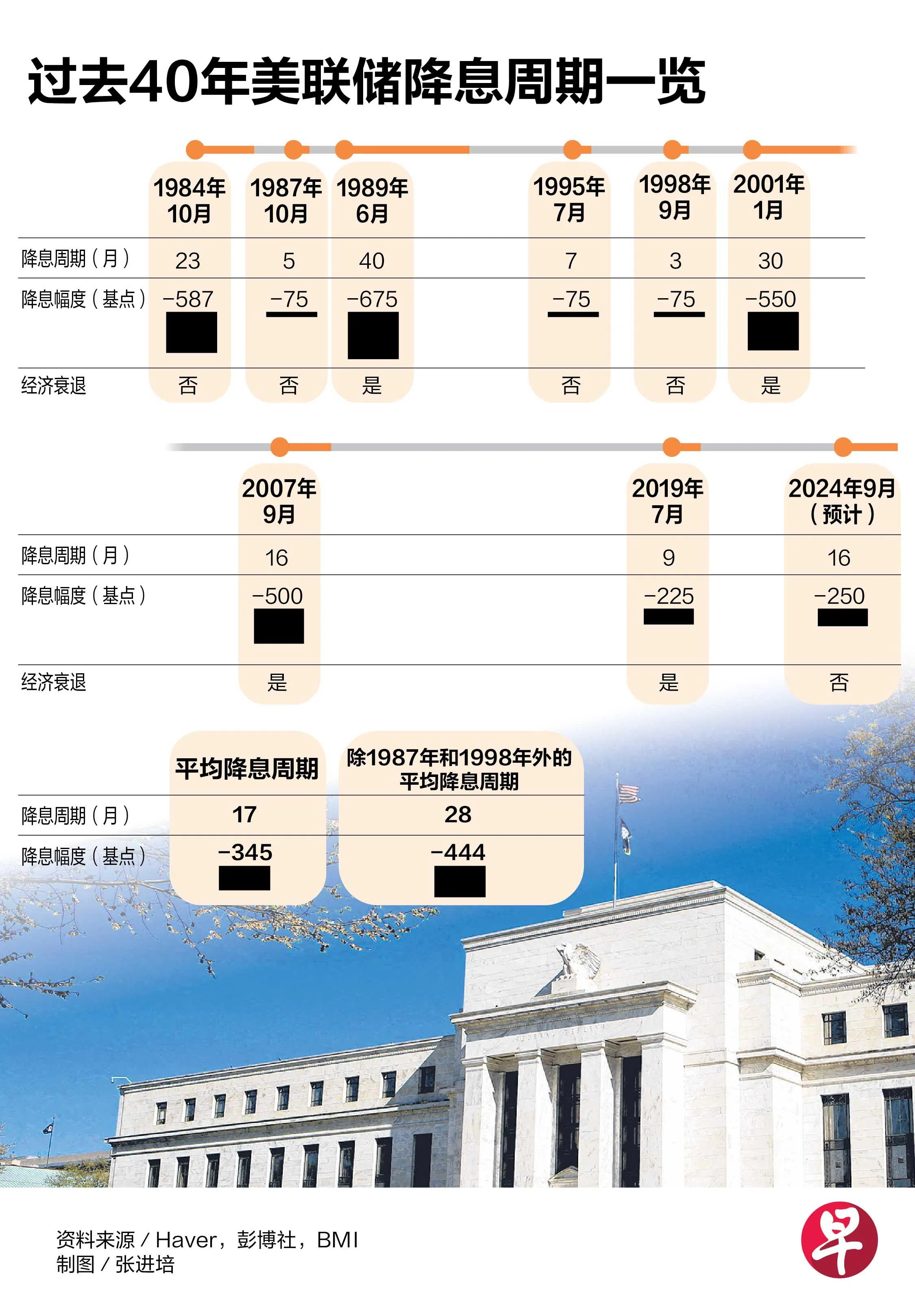 信息服务公司Fitch Solutions旗下研究机构BMI在一份报告中预计,美联储今年的降息幅度将在50到75个基点,低于市场普遍预期的100个基点。从历史数据来看,过去40年中,美联储的降息周期平均持续约17个月,总降息幅度为345个基点。如果排除1987年和1998年这两个较短的降息周期,降息周期的平均时长为28个月,降息幅度则为444个基点。
