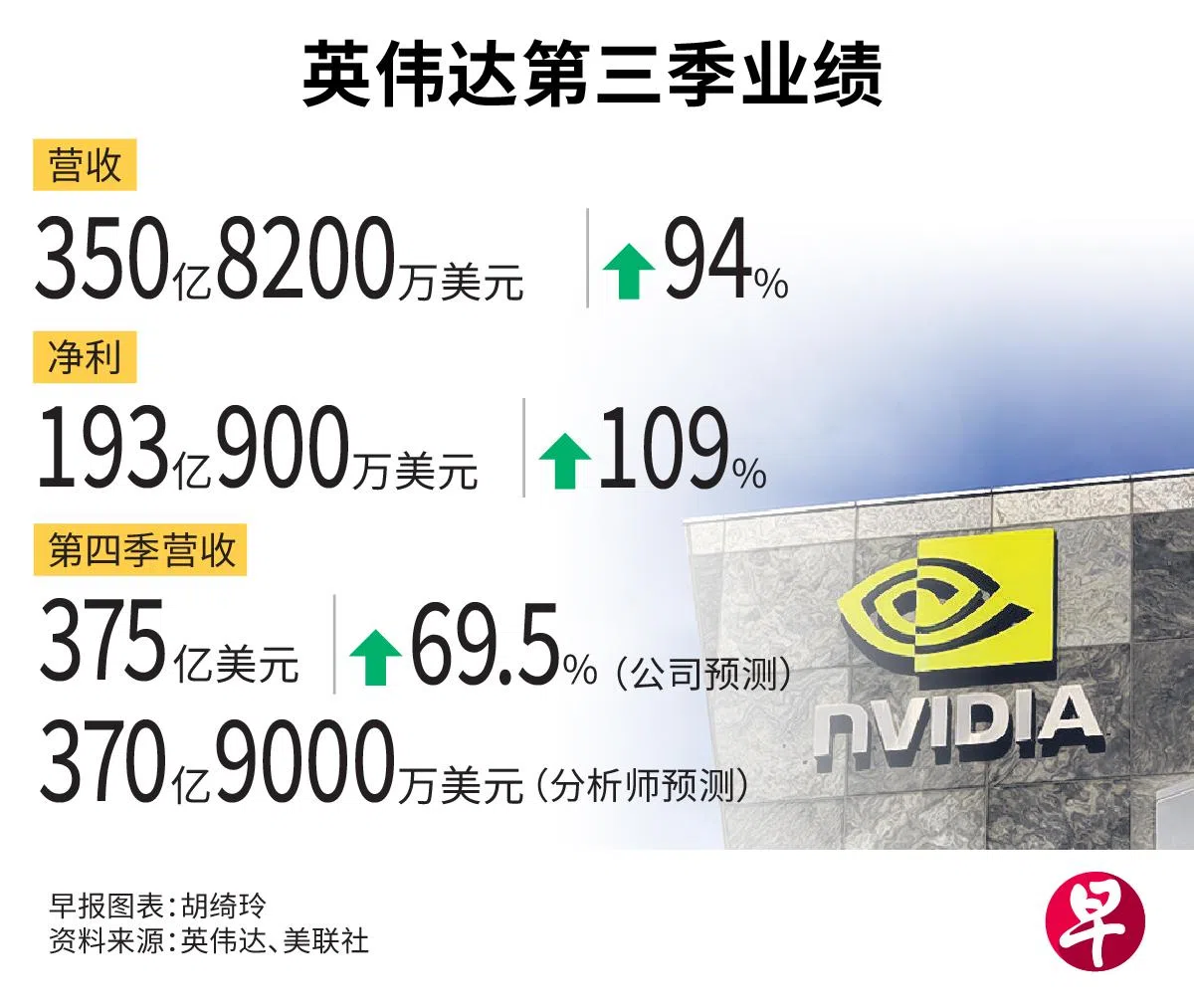 英伟达在星期四(11月21日)公布第三季业绩。公司营收达350亿8200万美元(约470亿9000万新元),同比增长94%。净利达到193亿零900万美元,同比增长109%。