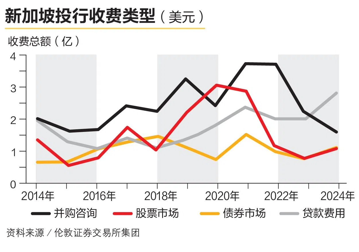 伦敦证券交易所集团(LSEG)发布的最新报告显示,新加坡投行2024年收费来源,股票和债务资本市场的费用增幅最大,双双年增42%,分别达到1亿零870万美元及1亿零640万美元。成功合并与收购案(M&A)所得咨询费,则同比大跌27%至1亿6310万美元。