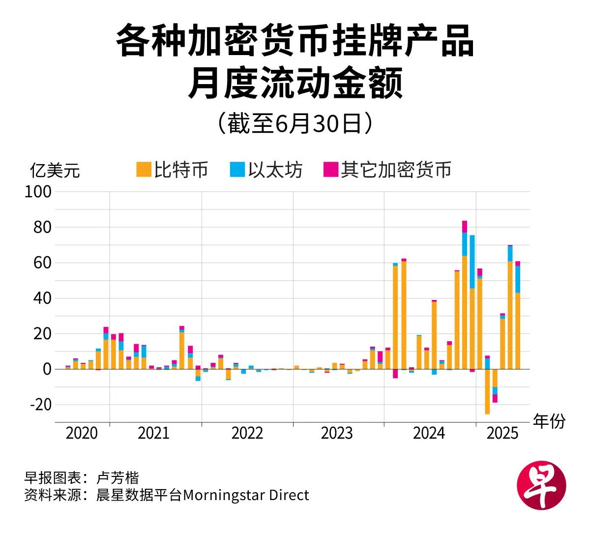 截至今年6月30日,全球比特币挂牌产品(Exchange-Traded Product,简称ETP)持有量已攀升至1586亿2000万美元(约2027亿新元);全球以太坊(Ethereum)ETP持有量攀升至146亿5000万美元,其他种类加密货币ETP持有量则攀升至101亿6000万美元。