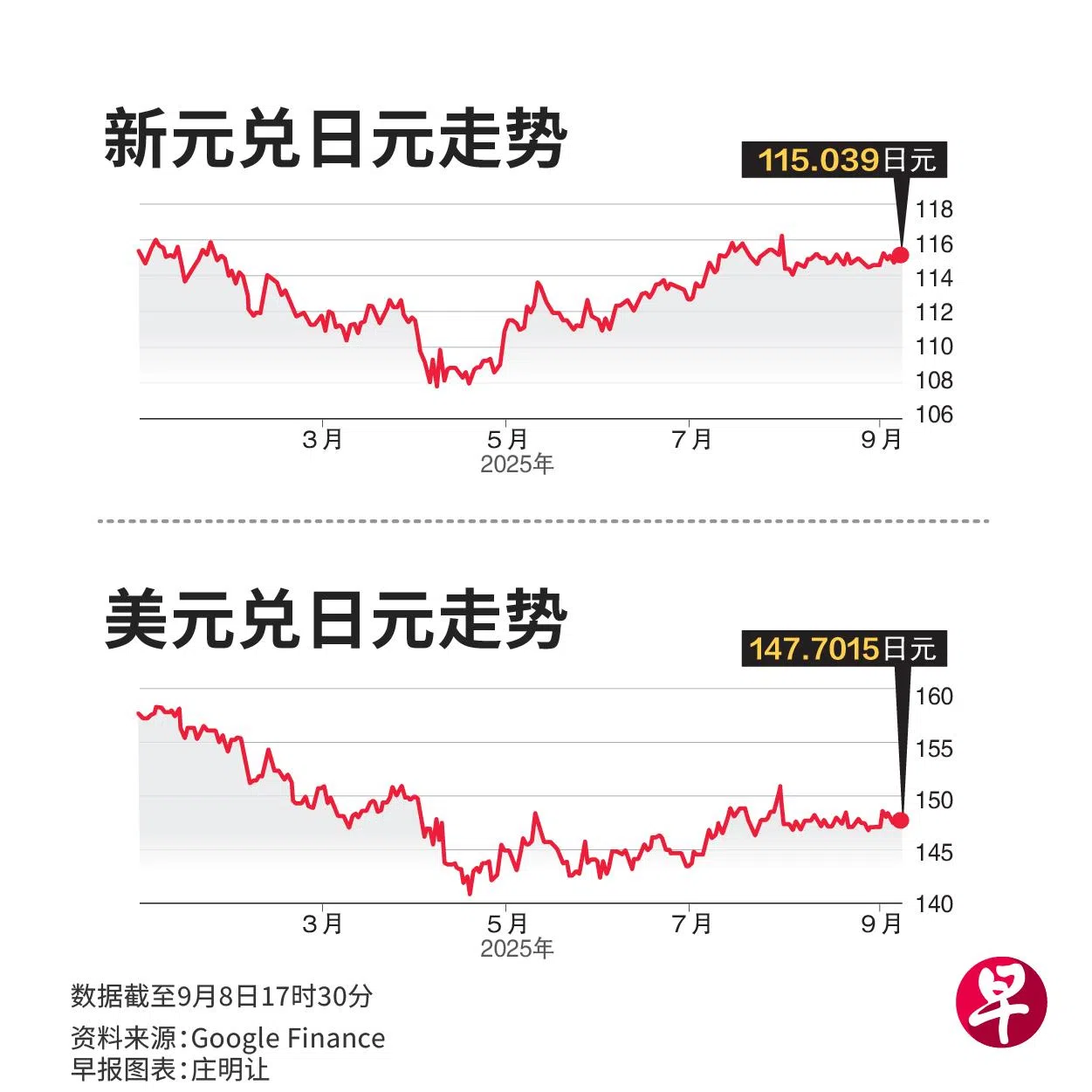 日元兑新元和兑美元汇率均呈下跌趋势。截至星期一下午6时30分,1新元可兑换115.065日元,1美元可兑换147.7525日元。