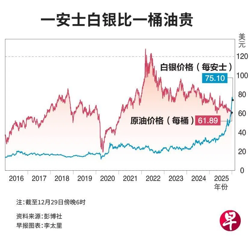 受供应趋紧、工业需求强劲及美国减息预期推动,白银价格星期一(12月29日)首次突破每安士80美元(102.8新元)大关,早盘一度攀至每安士83.62美元,创下历史新高。
