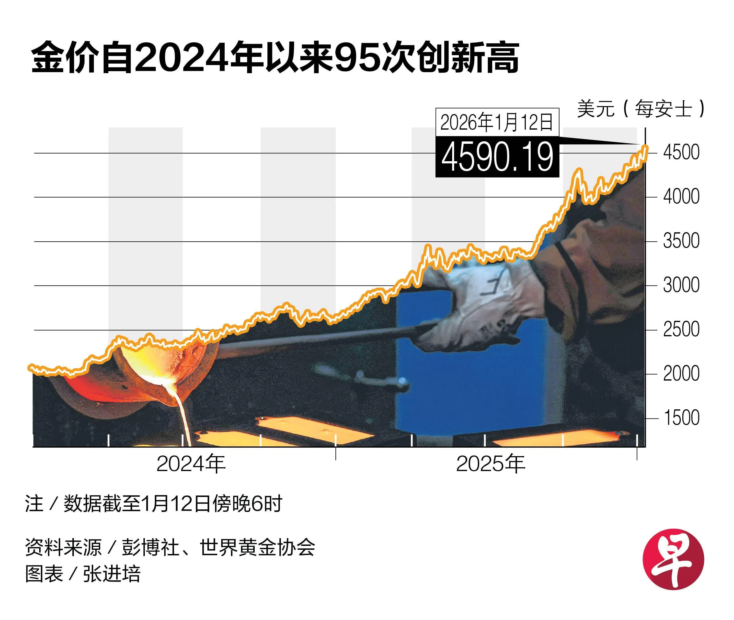 受地缘政治局势加剧,以及市场对美国降息预期升温的推动,黄金价格在2026年开年持续走高,星期一(1月12日)一度冲破每安士4600美元的水平。自2024年以来,黄金价格已接近100次刷新纪录。