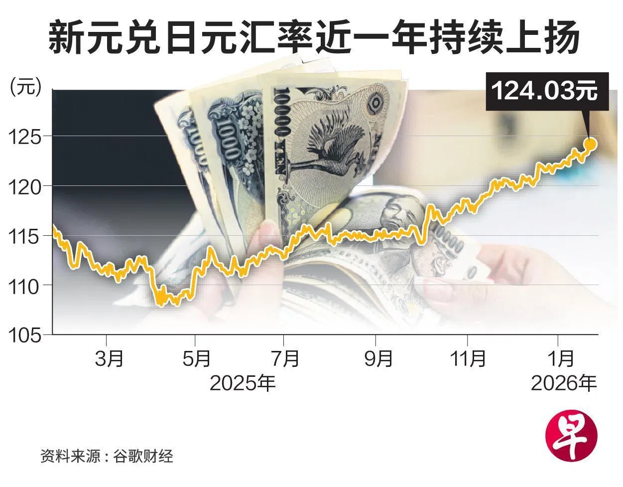 新元兑日元汇率在星期五上午涨至124以上,一度达到124.0387,之后持续震荡。截至下午1时43分,新元兑日元报124.0233,到下午4时55分进一步回落,报123.677。