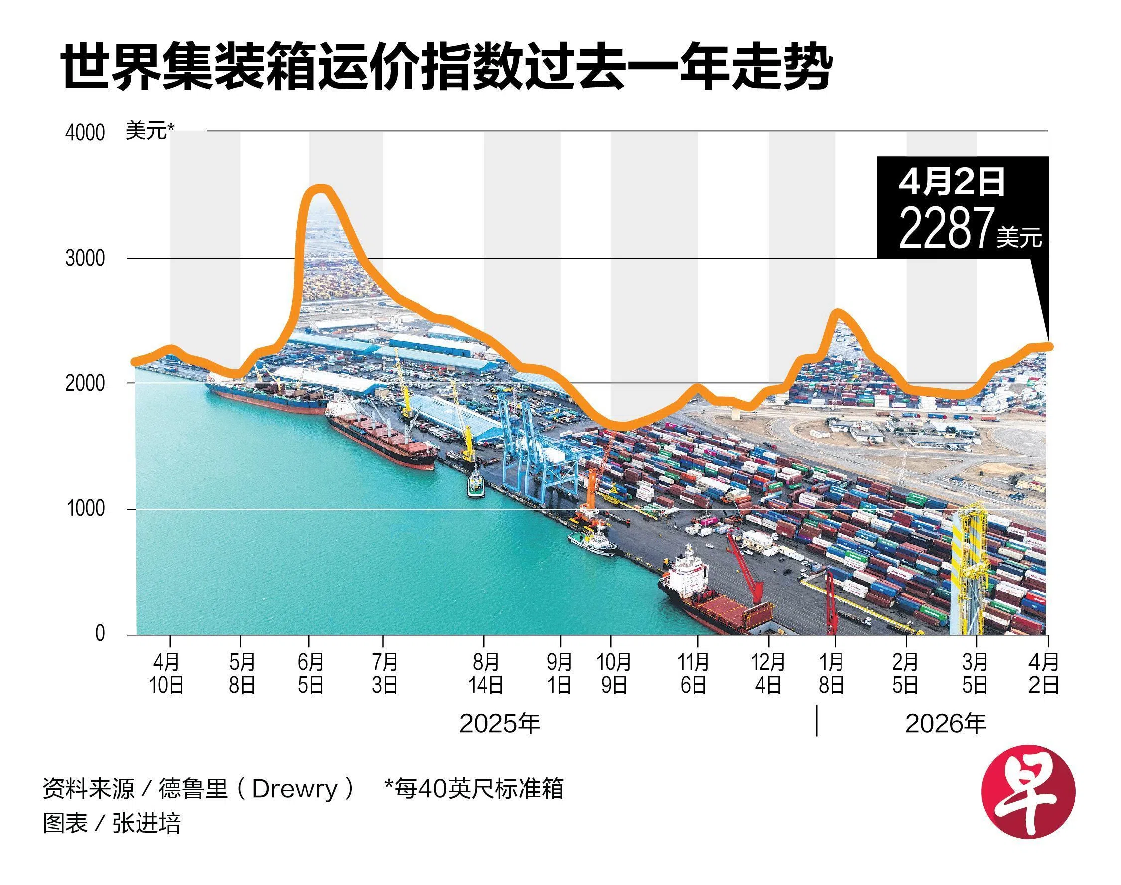 其中,海运咨询机构德鲁里(Drewry)编制的世界集装箱运价指数(World Container Index,简称WCI)显示,美伊战争前每40英尺标准箱的运费为1899美元,截至4月2日已升至2287美元,涨幅约20%;亚洲内的集装箱运价指数则从552美元上涨至865美元,涨幅高达57%。
