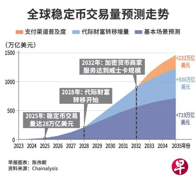 大量财富可能将向更易接受稳定币的新一代转移,加上在日常支付场景中的普及率与渗透率逐渐上升,预计到2035年,稳定币交易量有望增长至接近1500万亿美元(约1912万亿新元)。