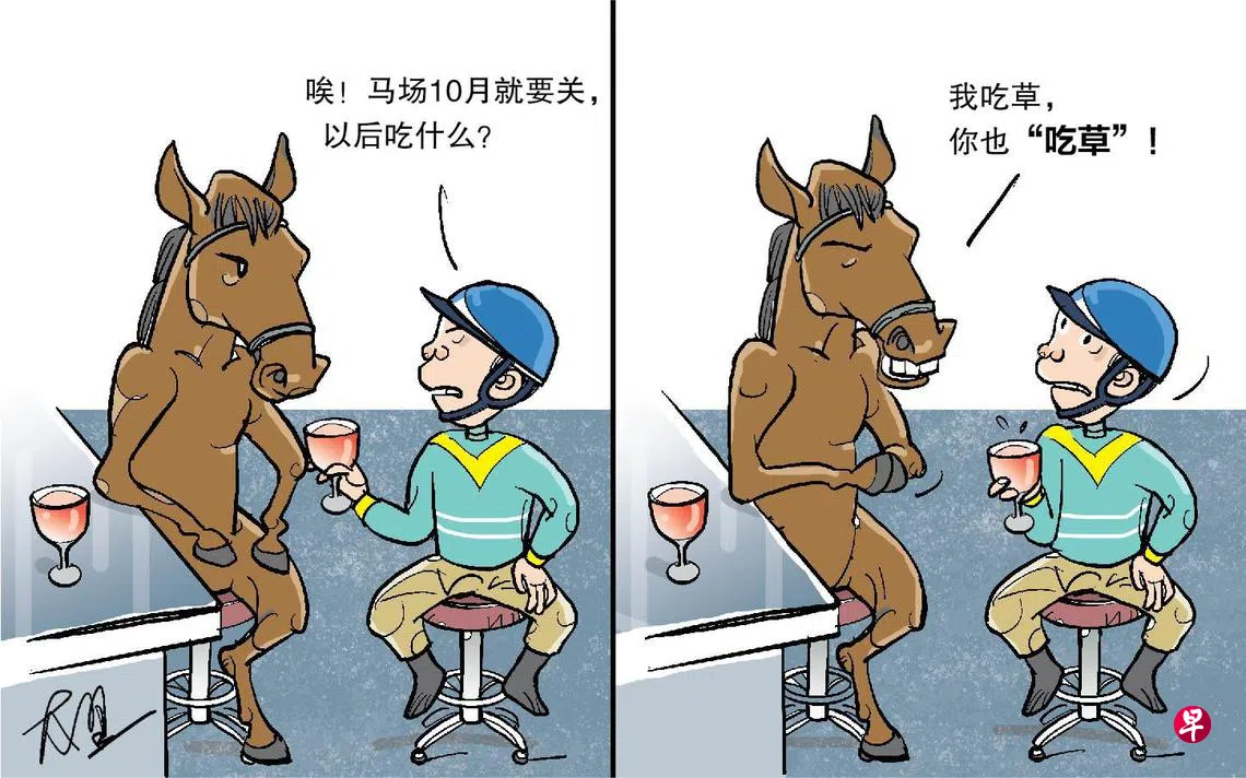 马儿不必跑 也能吃青草工作和休闲方式,随潮流而变。 因赌马人数逐年减少,今年10月5日,披着数字战袍的马即将在克兰芝跑完最后一程,见证本地超过180年的赛马活动熄灯。 那以后,还留在新加坡的它们会发现,不必流汗奔跑,走出马廐就有遍地青草,管饱;骑在马上的人会知道,没有哪样工作,可以一直做,风光到老。 赌徒不进场,才明白,把时间花在其他嗜好,更好。 想法版漫画马赛马上一篇早报漫画下一篇早报漫画购买此文章