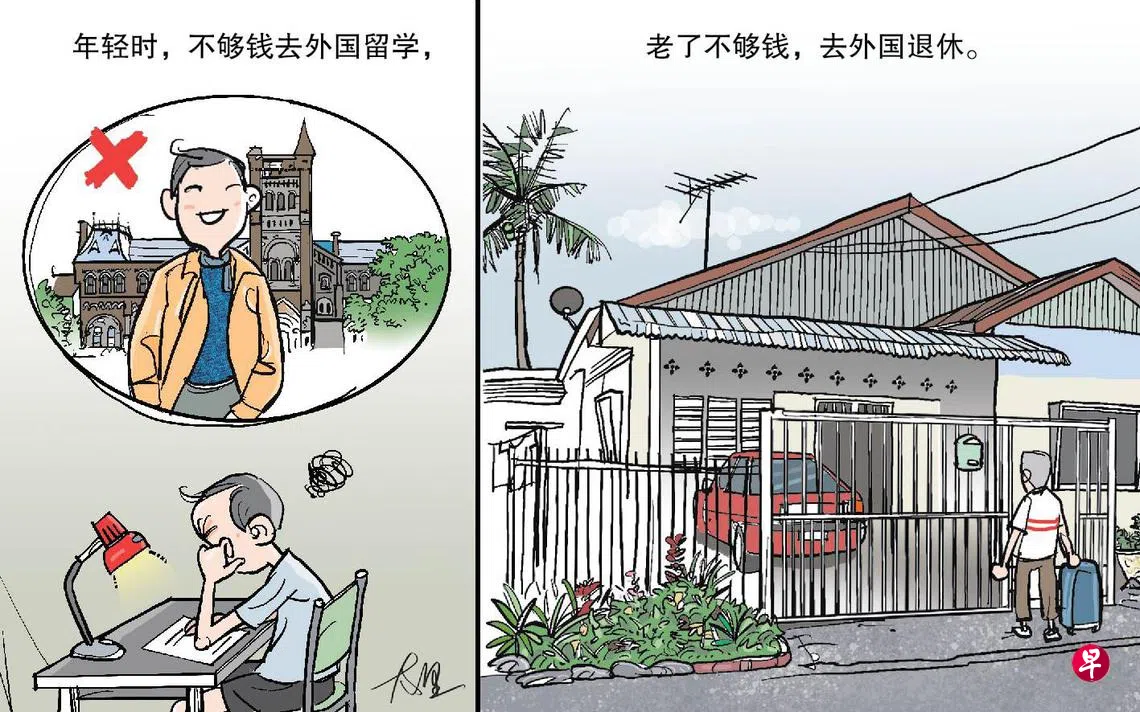 年少妄想国外月圆 退休实践外国省钱年轻时向往出国。都说外国月亮比较圆,还说飞得越远,看到的月亮越大。夜夜思慕,总得亲自看一眼才甘心,最好还能住上几年!可惜啊,出国留学要大把钱,非人人可以实现。 多少人就这样抱憾大半辈子。近日,有些不甘心的老人聊发少年狂,左牵行李,右拿护照,出国去。 不必走远,过了长堤,找间平房,天天小区按摩喝茶聊天,夜夜门前赏月观星。 老来,不求月圆,更重要的是省钱。 想法版漫画留学养老金上一篇早报漫画下一篇早报漫画购买此文章