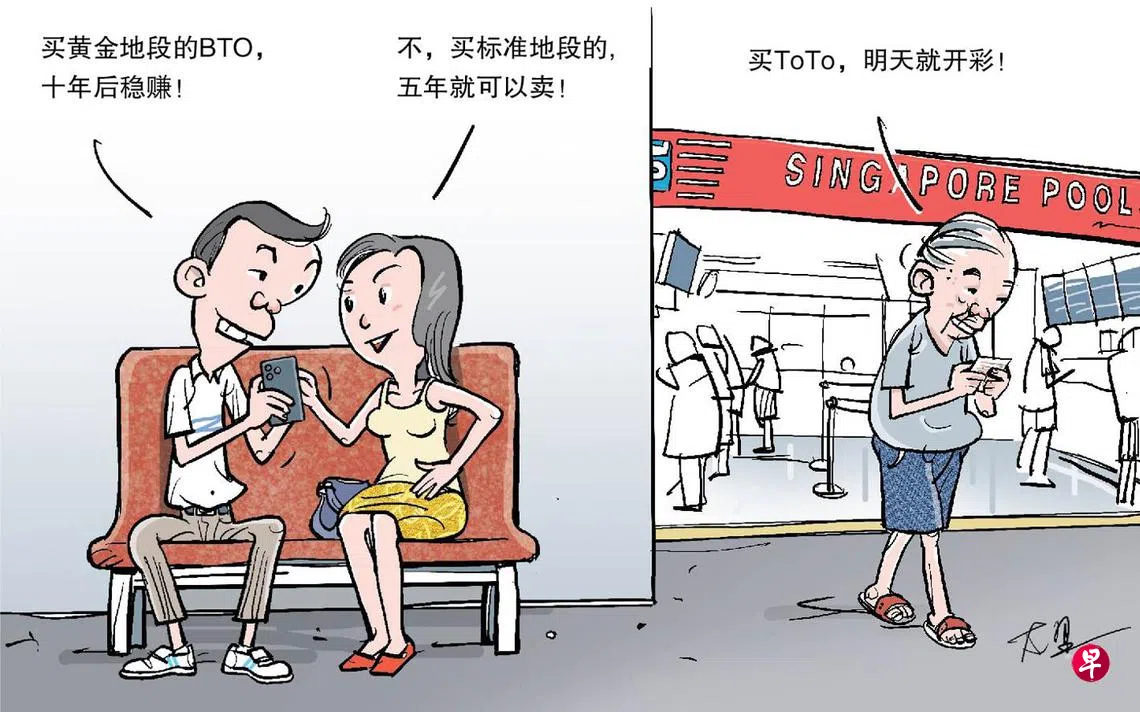 赶紧买了洗洗睡 做个美梦再说吧家明与玫瑰在谈婚论嫁,两家人婚礼、酒席什么都谈妥了,就剩一件事还在争执:该申请哪里的BTO? 家明拍胸口说:“黄金地段组屋最稀缺,10年后肯定变巨钻!9%津贴回收小意思啦!” 玫瑰则说:“10年后谁知道市场什么样子,不如买标准地段的,五年后快快赚它一笔再说!” 后来两人决定先去买明天的TOTO,不约而同地说:“中头奖的话,直接买公寓咯!” 想法版漫画组屋上一篇早报漫画下一篇早报漫画购买此文章
