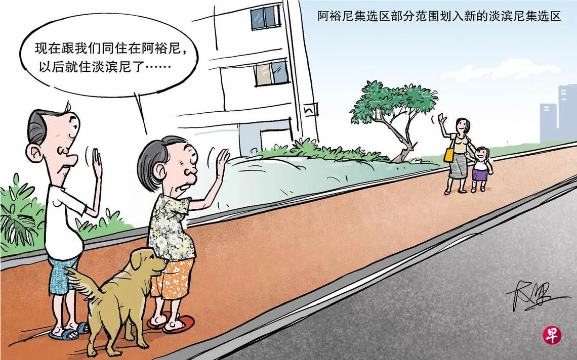 阿裕尼变淡滨尼 一样的尼不同的区全国选区范围检讨委员会报告出炉后,同事碰面开玩笑互问:“你是哪里人?”小小的新加坡一下子变大了,蔡厝港人、女皇镇人、三巴旺西人济济一堂好不热闹。 严先生的女儿阿玉婚后搬到附近公寓,步行可及,两处原本都属阿裕尼集选区,他太太特开心,感觉女儿和孙女都在身边不远。 现在线这么一划,女儿一家就属于淡滨尼集选区,真“嫁”出去了! 严太太说:“我知道阿玉没搬,可心里总是怪怪的……” 想法版漫画大选上一篇早报漫画下一篇早报漫画购买此文章
