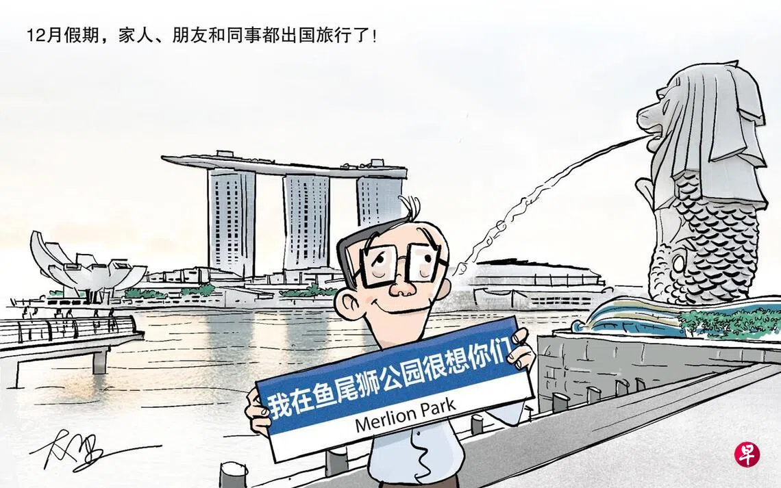 想你的风吹到哪里 去年早就计划好了每年12月,是新加坡人出国旅游的旺季。新加坡统计局数据显示,去年12月本地居民的出国人次高达130万,远超每月平均的约86万人次。而且,这数字只计“搭飞机和乘船”出国的人,不包括通过两个陆路通道前往马国的新加坡人。在想,如果新加坡岛下装着弹簧,年底会不会因为负载轻了而升高几个厘米?地面即使升高了可能你也无感,但办公室的同事少了,你肯定感觉得到——因为工作增加了 :( ! 想法版漫画上一篇王锦松漫画下一篇早报漫画购买此文章