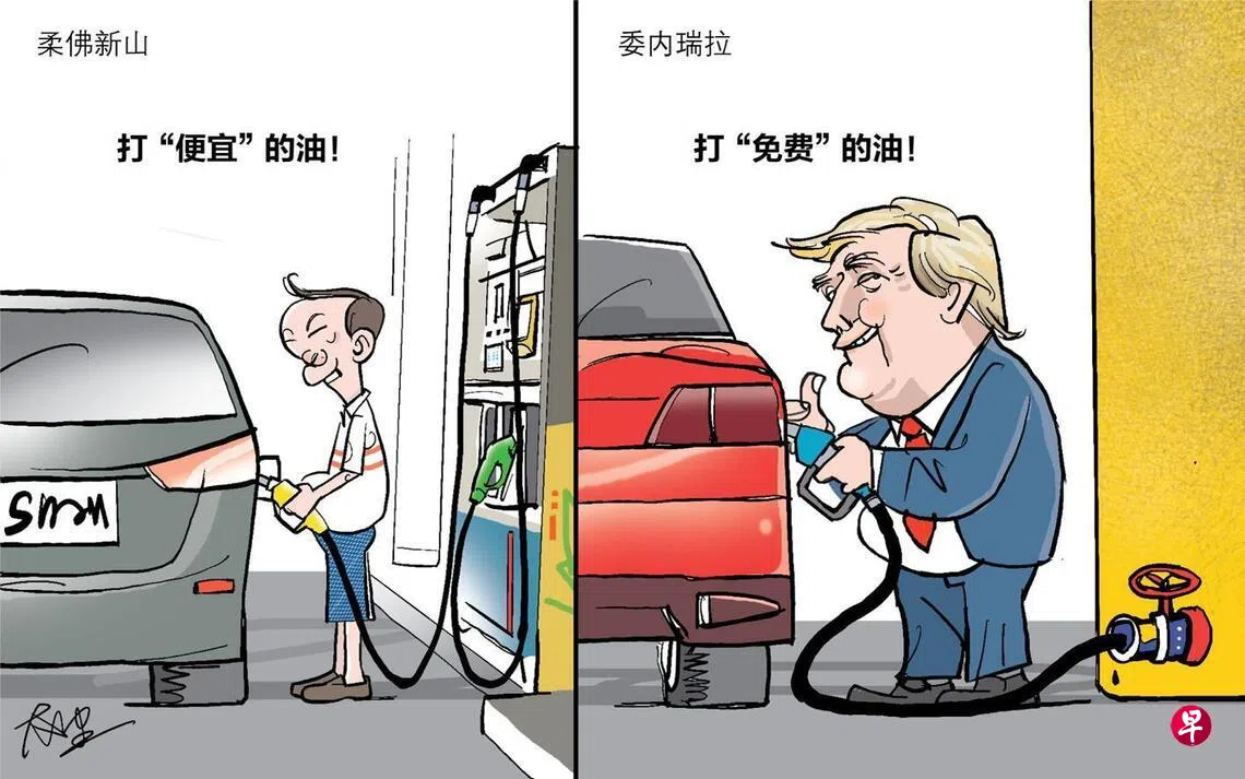 跨境打油 敢打就有油“油”真不是个好东西,你想,如果没有它,长堤肯定就不那么拥挤,而新加坡车主跨境添油时施展“大力摇车功”的场景,就不会成为经典——还天天上演,永不下画。“油”也是个乱源,委内瑞拉的石油探明储量稳居世界第一,人民却没有多少好日子,社会毒品泛滥,国家长期动荡。终于等到特朗普的跨境关切,可惜委内瑞拉人民在街头欢庆马杜罗下台,期待特朗普指引美好生活时,却发现他在阴暗的委家后院清点石油库存,没空跟大伙儿同欢。 漫画上一篇王锦松漫画下一篇早报漫画购买此文章