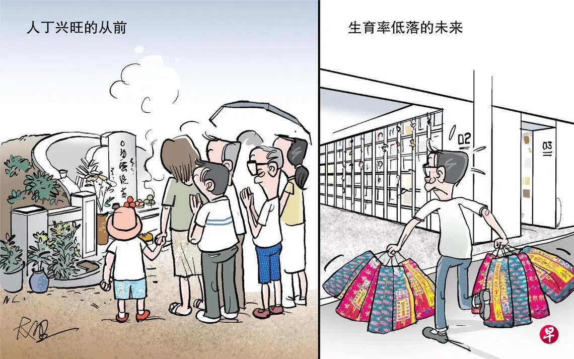 今天扫墓人挤人 他年祭我知是谁以前一对夫妇可繁衍数十个子孙,加上媳妇女婿和侄甥,墓前百人涌动祭拜并不少见;但如果国人不婚不育情况恶化,10年后一个单身者便要对比七八个先人,逝者灵位平日冷清不说,清明那天难得有人影,到时会不会还“看不清楚”来人是谁,对方便已收拾完毕,匆匆赶往下一场?这问题市场已经有应对方法——网上祭祖,虚拟扫墓,真人专业代扫,不一而足。当然,这是假设到时扫墓这个习俗还在,活着的人仍有哀思无尽在心田。 漫画上一篇早报漫画故事下一篇早报漫画购买此文章