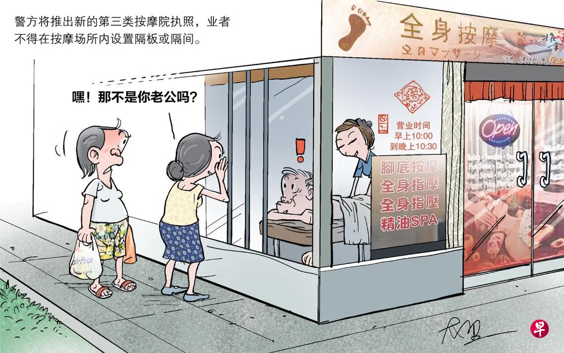 卖不卖狗肉 亮堂堂一眼看透很多人喜欢按摩,认为它除了有助于缓解身体酸痛,也是最简易的身心享受。很多新加坡人可以为了这档事,忍受一两个钟头的塞车之苦,到长堤彼岸“躺平、承压”。另一方面,由于按摩技术门槛不高,任何人只要体力足够,就能以此谋生。供需关系分明,所以不论行情好坏,按摩院从不消失。鉴于越来越多按摩院被怀疑涉及卖淫,警方从今年下半年起,为开放式按摩院推出新的第三类执照,设下更严格的标准,包括按摩场所内不得设置房间、隔板或隔间。 想法版上一篇早报漫画专栏下一篇王锦松漫画购买此文章