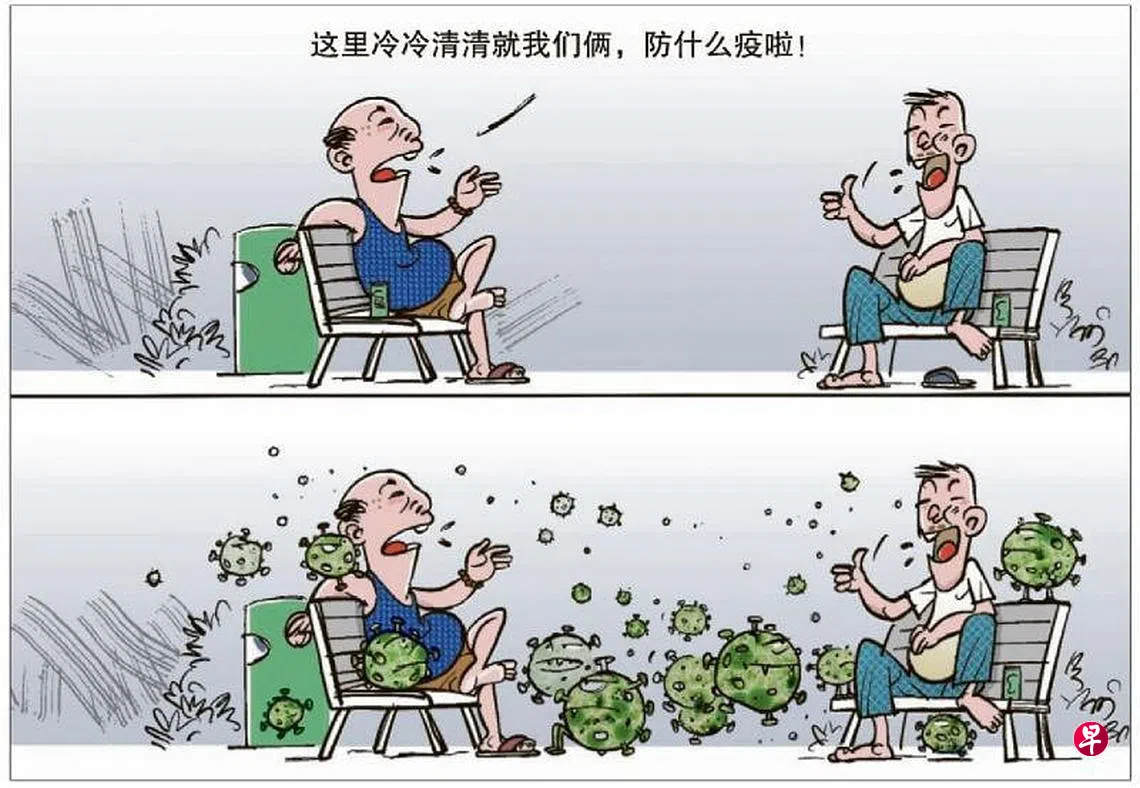 当局可否采用这类漫画制作成海报,放置在小贩中心、咖啡店、组屋底层等公共场所,相信能起到阻吓作用。如果只凭言语上的提醒、劝导或其他传媒信息,不一定能让一些民众理解或想象自己在某种情况下,可能感染病毒或正在传播它。