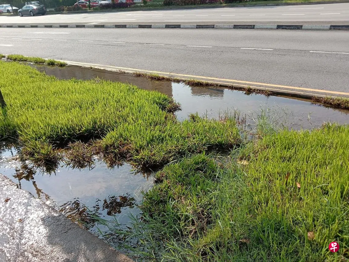 日前看到的情况是,在部分地段,湖水漫出堤坝顶端的草地,顺着外侧溢流到淡滨尼10道旁边的人行道,然后流入路边的排水沟渠,有些地方的水流还相当大。这种情况其实隐藏一定的危险,这种漫堤长期下来,肯定会泡软土质,遭遇暴雨袭击的时候,就可能形成部分溃堤,而矿湖的水面估计高出附近路面两米左右,一旦溃堤将对附近的车辆行人造成危险。