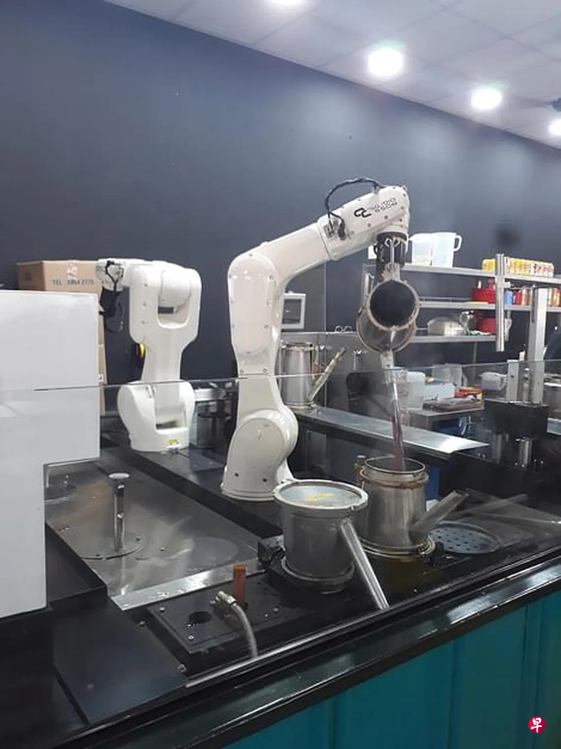 在大士工业区,有家餐厅的茶水摊老板,为节省人力成本及解决人手难请的头痛问题,干脆一劳永逸,采用了两台六轴机械臂来冲咖啡。