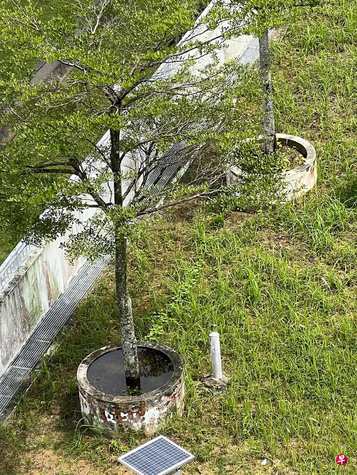 榜鹅临原坪(Edgefield Plains)第672座多层停车场的顶层花园,有两个种树的石盆积水已久,我担心会成为伊蚊滋生的温床,于是透过“一联通”(OneService)应用向当局提出反馈。