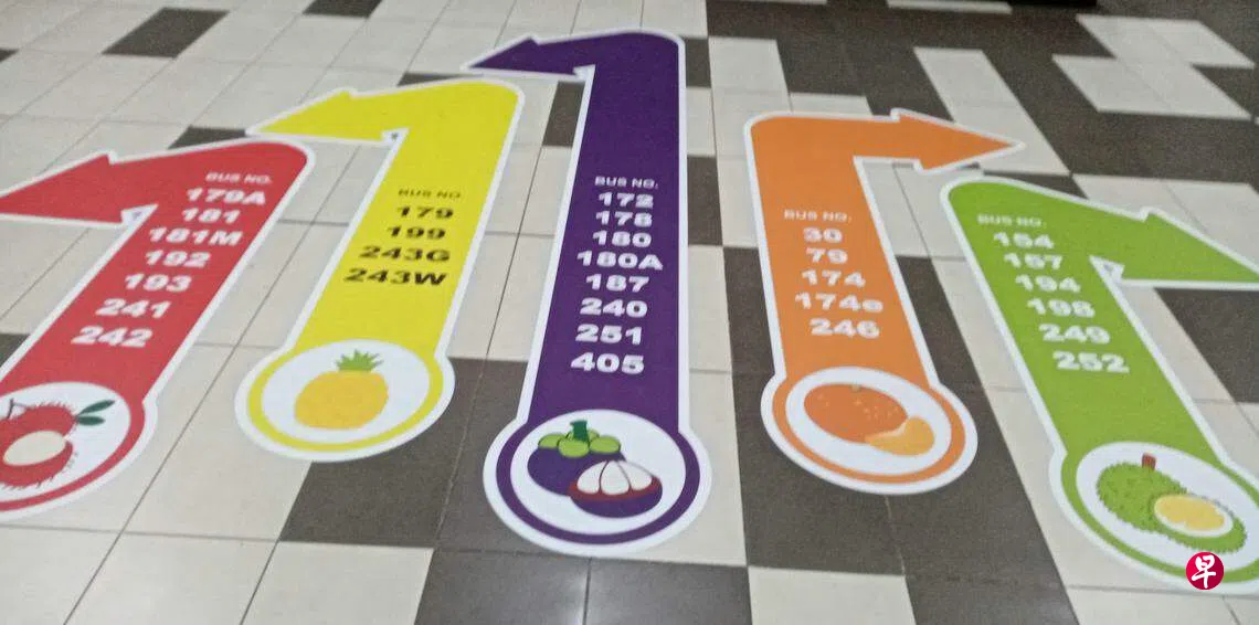 我家邻近的裕廊坊巴士转换站,近期出现了一些改善服务素质的小举措。巴士公司在转换站的步行地板上,贴上以不同颜色和水果图案区分的巴士服务所在位置的指示图。巨型的指示图设计颜色鲜艳,让人一目了然,比起过去悬挂的指示牌更有效,而且可以同时标出所有巴士服务的所在之处。