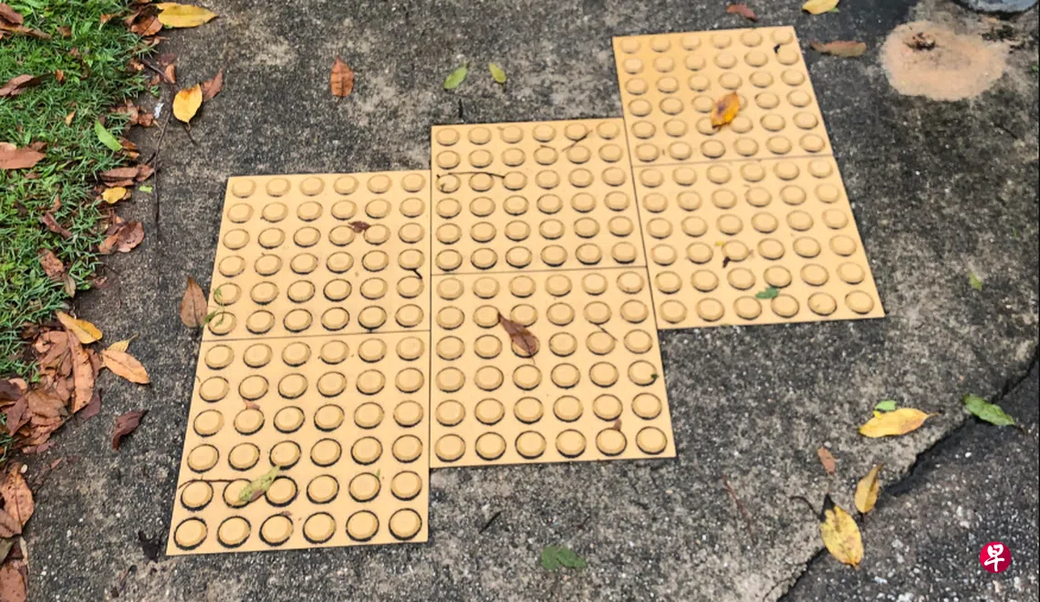 4月20日中午,一场倾盆大雨后,我在蔡厝港1道,靠近B44101号巴士站,踩到触感瓷砖路面时,就险些滑倒。对于触感瓷砖路面来说,具有良好的防滑性材质至关重要。