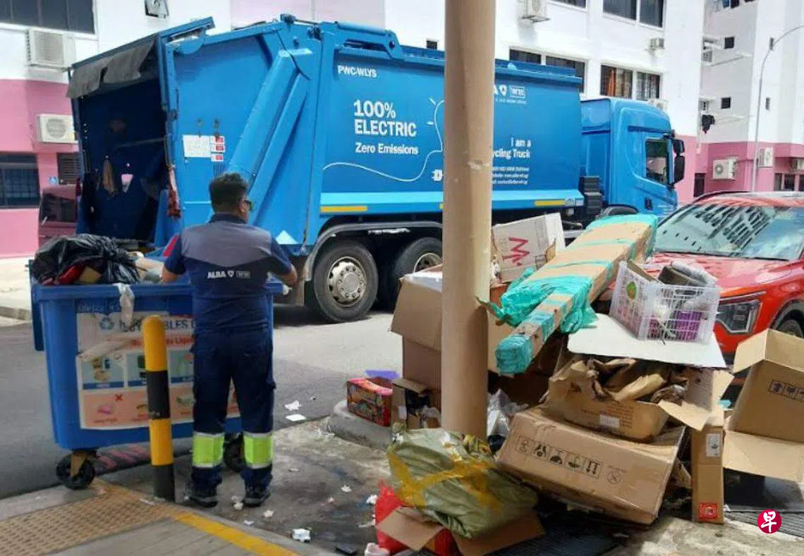 2月4日下午,我路经裕廊西42街附近的组屋区,见到两个回收箱都堆满杂物,几个路过的居民还驻足围观,不但回收箱已堆满,地面上也丢弃了旧枕头、鞋子、香蕉皮、塑料袋、废纸巾和厚纸皮等,很多都不属于环保垃圾。回收箱上注明哪些是可回收的物品,例如纸张、金属、塑料及玻璃瓶等,难道丢弃垃圾的人没有看到吗?