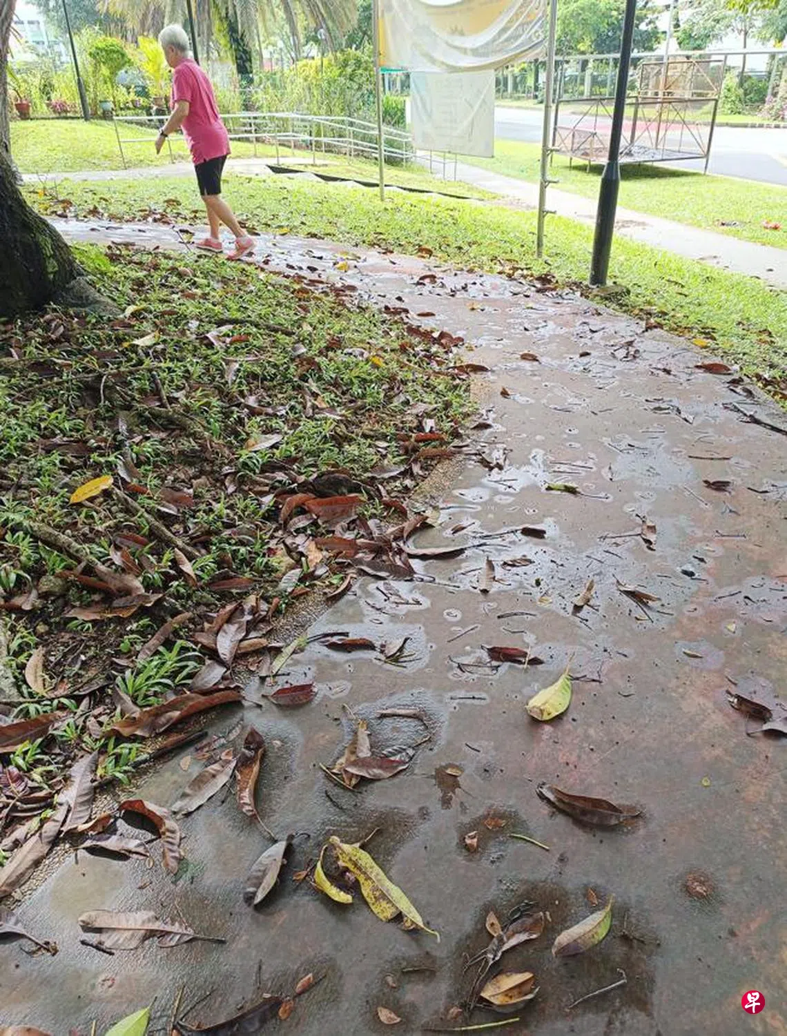 雨后清晨在邻里漫步,一位老人家在前方步道健行。我心里赞赏,她能保持活跃是老龄化社会银发族的好榜样。然而,仔细看了前方步道的情况,不禁为使用步道者的安全担心。