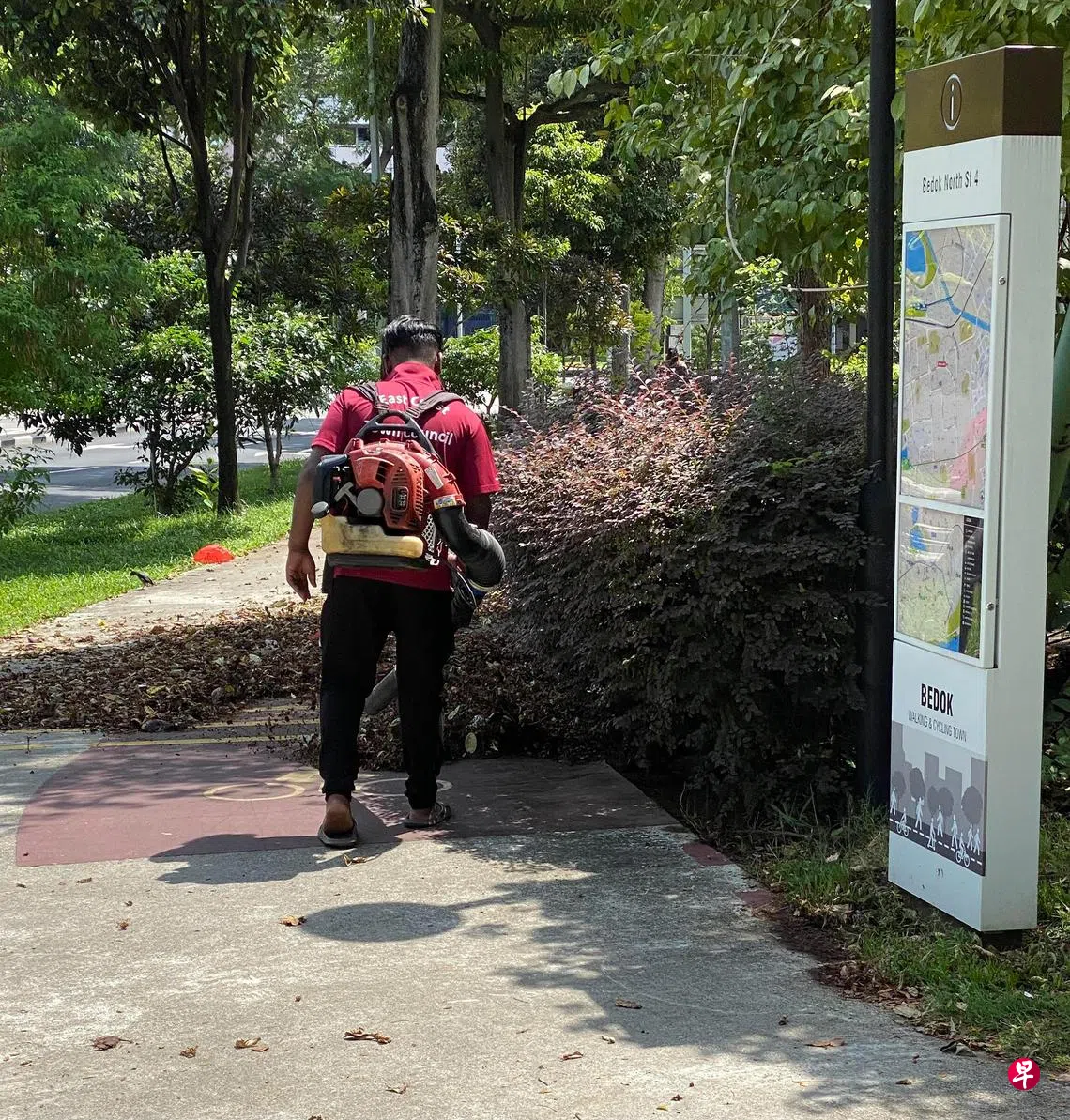 我每天晨运,无论在停车场、市镇中心行人道还是在公园,运动时总会遇到清洁工人在清理落叶。他们先把汽油倒入吹风机,发动机器,背上肩,开始吹扫落叶。每次经过总会闻到汽油臭味,味道也随风四处飘散,还有蓝色烟雾。