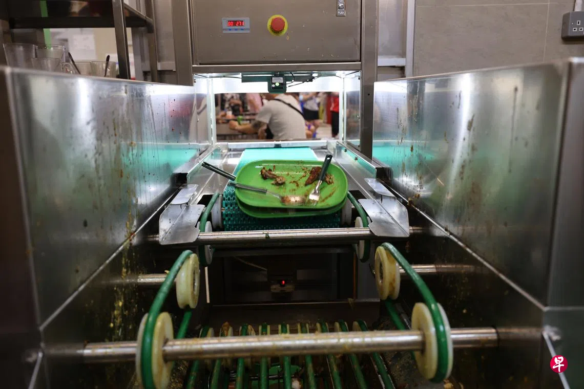 我在榜鹅第273C座组屋的一家咖啡店当收碗工,顾客一般都将碗盘放回收碗柜。这里的面积不大,不太可能安装输送带,除非重新规划和扩充面积。