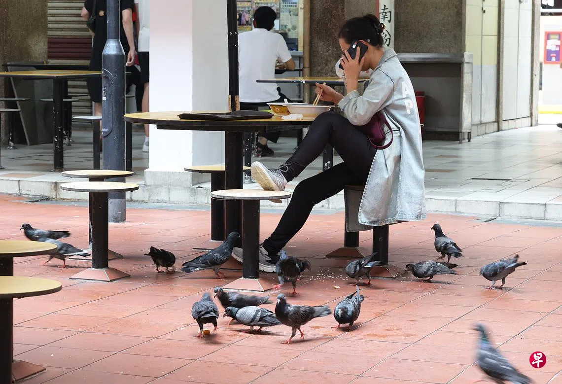 小贩中心和咖啡店是重要的公共饮食场所,但近年来,乌鸦、鸽子、八哥等鸟类聚集,滋扰食客,对环境卫生构成威胁,破坏原本舒适的用餐体验。虽然政府在一些小贩中心安装防鸟网和尖刺,但仍不能有效解决问题。
