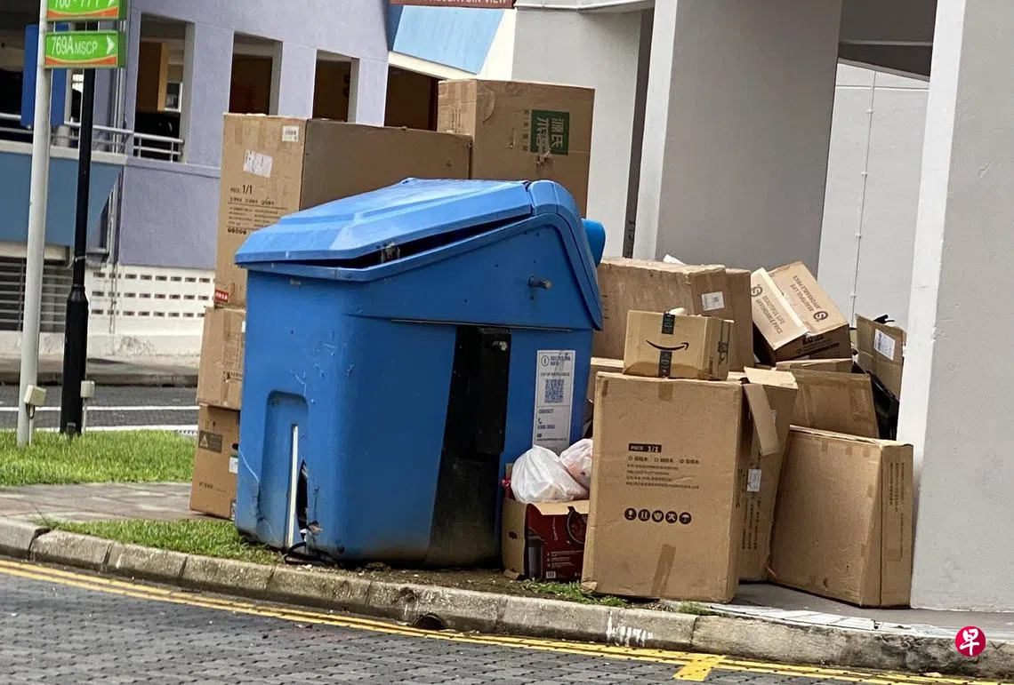 等不到这些“加龙古尼”,人们就直接将这些旧货丢弃。全国各个角落的大型垃圾箱,尤其是组屋区和私人住宅区,几乎每天都可见到堆积如山的废纸箱。