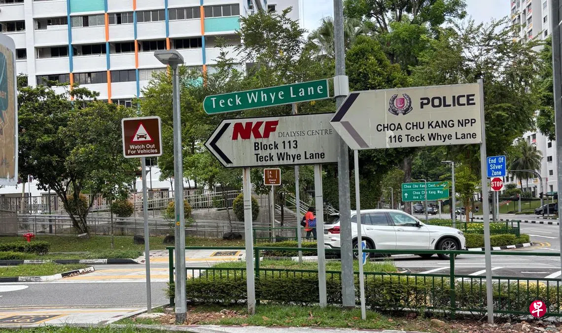 “Teck Whye Lane”的街道路牌被两个大型指示牌遮挡,分别指向新加坡肾脏基金会(NKF)洗肾中心(第113座)及蔡厝港邻里警岗(第116座)。