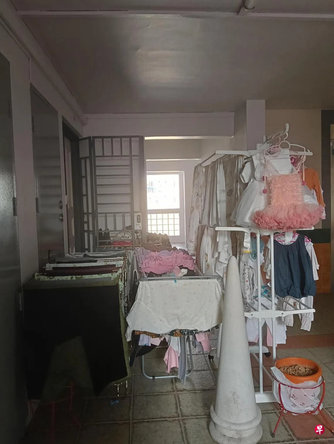上周,一个大型晾衣架忽然倒下,阻挡通往垃圾槽和楼梯口的路,幸好没有伤到人。由于我也患有骨质疏松症,我很担心被那些大型晾衣架压到。现在,我如果要丢垃圾,还得把垃圾袋拿到楼下的垃圾桶。