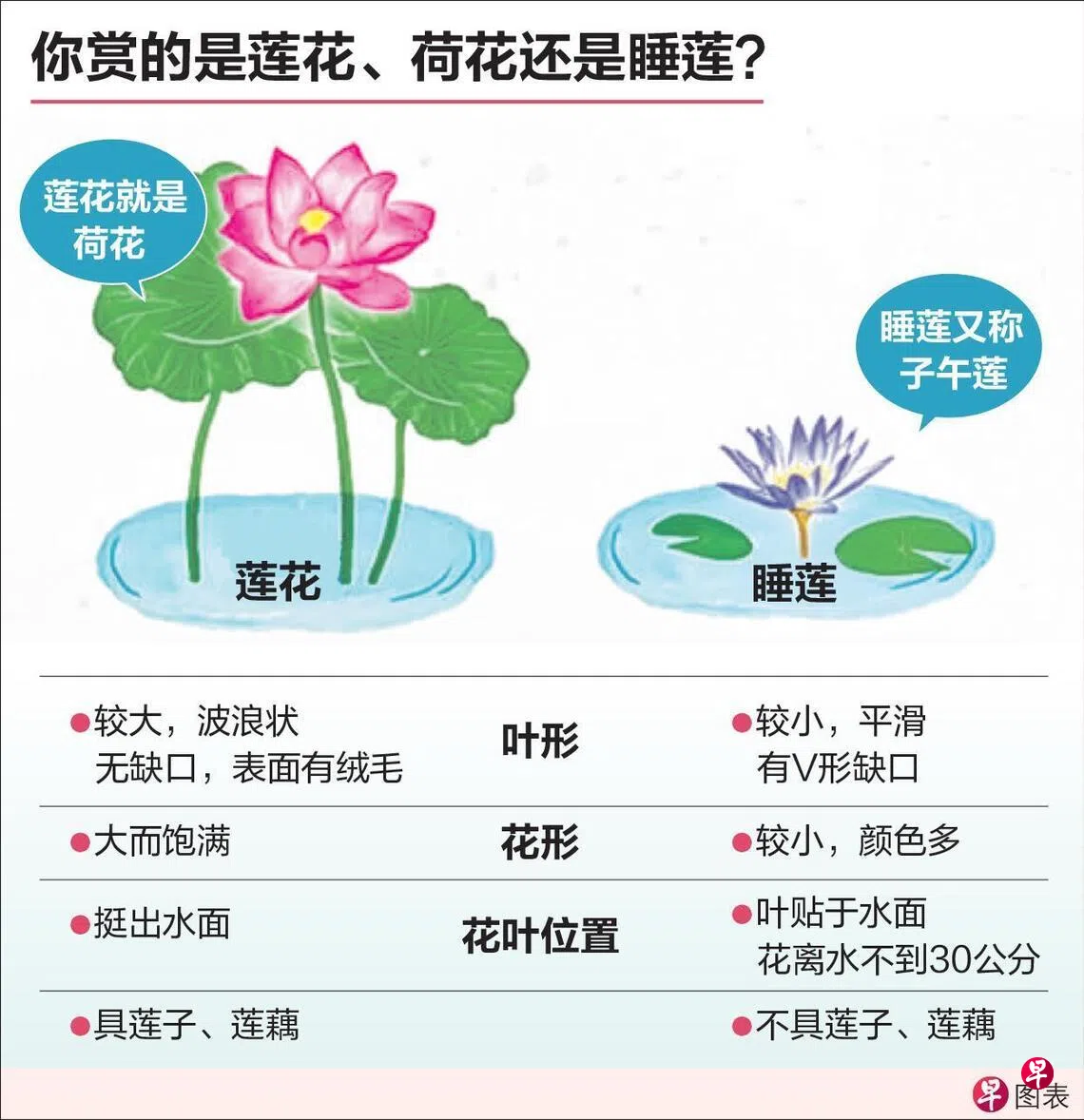 睡莲与荷花在大众认知中常被混淆,两者在植物学上分属不同科属,形态亦有明显差别。睡莲的花与叶多浮于水面,叶片边缘带有缺口;而荷花的花与叶则挺立于水面之上,叶片完整呈圆形,这是较容易辨认的特征。