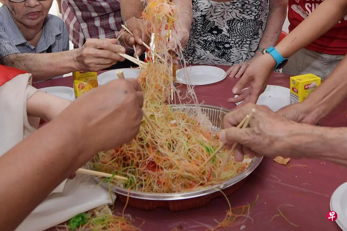 捞鱼生是本地华人新年独特的庆祝方式。这本是一道菜式,在大年初七人日这一天,聚合一家大小一起吃。这道菜带有吉祥寓意,祈求来年好运发大财。它以可以生吃的鱼肉条为主,搭配各种有颜色的蔬菜丝或水果丝,以达到七彩缤纷、色泽诱人的目的。预先排列在一个大圆盘上,然后洒上白芝麻、花生碎、五香粉及胡椒粉等。