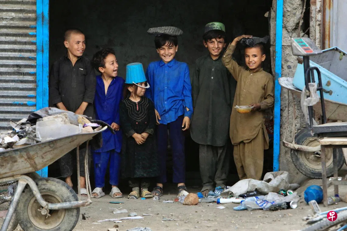 阿富汗喀布尔联合国世界粮食计划署的分发中心外,小朋友脸上洋溢着天真无邪的笑容,还摆了调皮的姿势,让人忍不住跟着他们一起微笑。