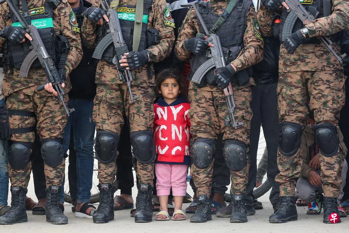 在释放人质的仪式上,蒙面的哈马斯武装分子将人质带到台上,强迫他们向聚集观看活动的加沙人挥手,甚至亲吻哈马斯战士的头部。