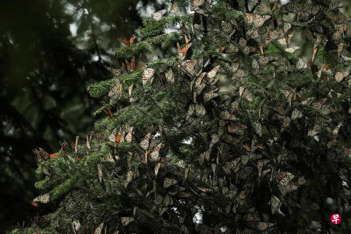 成群的蝴蝶停栖在冷杉林间,远远望去,宛如秋叶铺满树梢:褐、橙、黑交织,仿佛一个不断流转的万花筒。然而,这场每年如期上演的奇迹,正面对前所未有的威胁。