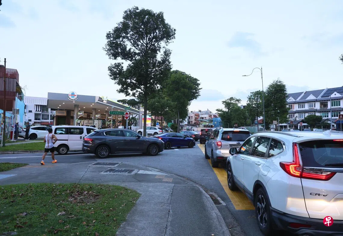 近日,德明路一家由小公司经营的添油站天天排起长长的车龙,以致影响附近的道路交通和巴士站运作,也有公众担心道路安全隐患。为了疏导交通,陆路交通管理局不得不临时在附近道路画上黄色网格线、延长巴士站,甚至派出辅警到场维持秩序。