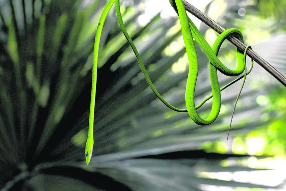 绿瘦蛇通常在白天时活动。它有着鲜艳的绿色蛇皮,让它能伪装在树叶中。它以蜥蜴、青蛙和小鸟等小动物为食。虽然绿瘦蛇有轻微毒性,但它生性害羞,喜欢远离人类,经常出现在灌木丛和公园中。