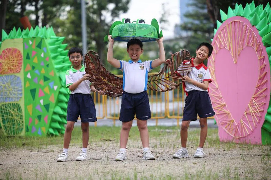 圣加俾尔小学的装置设计以可持续粮食为灵感,动员全校的力量一起收集牛奶盒,蚌壳和棕树叶,来制作装置上的配件。