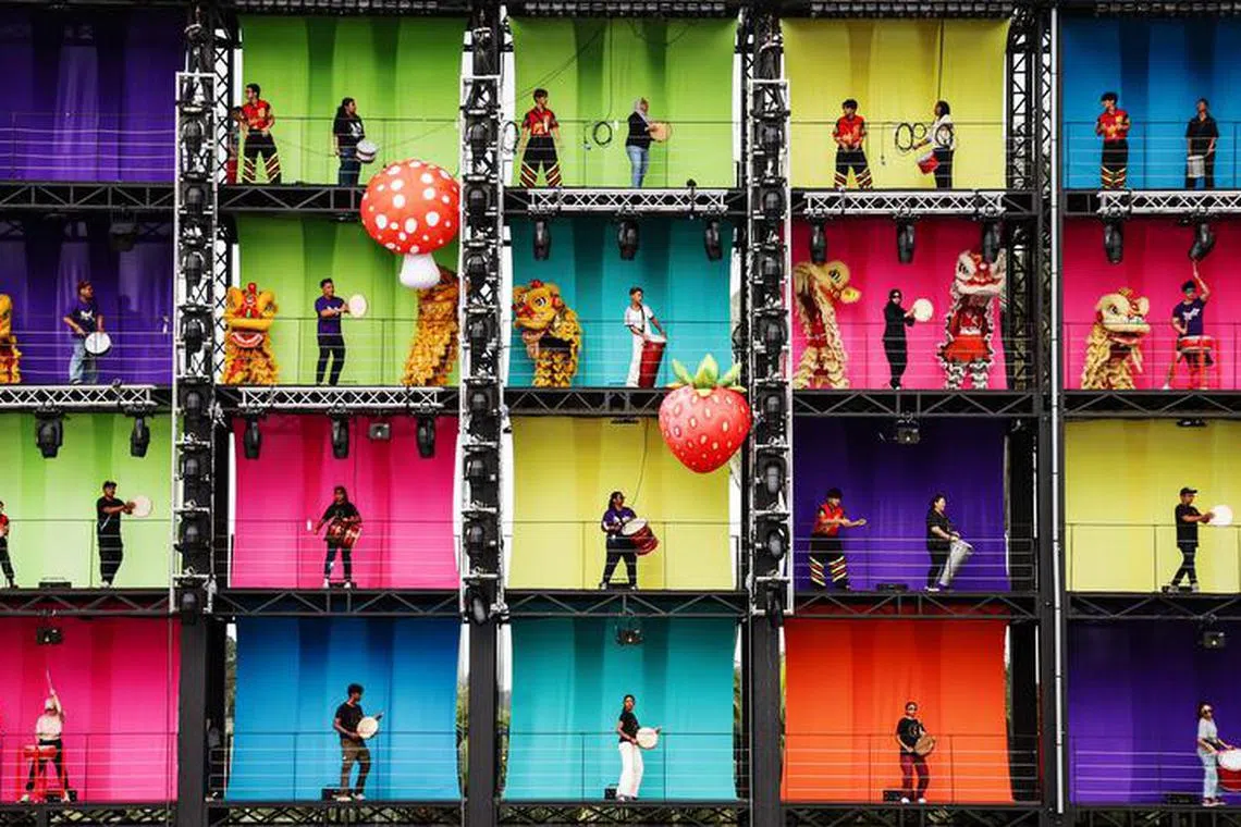 2. 60头舞狮将为妆艺大游行拉开序幕,在四层楼高的舞台,伴随富种族特色的打击乐器,欢庆新加坡建国60周年。