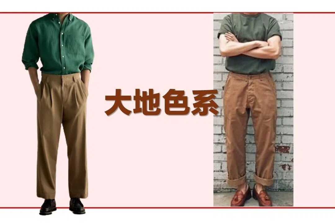 一些人可能会觉得这类大地色系的服饰稍显平淡,那在搭配上时可以选择其他鲜艳色系的单品。以男生为例,绿色T恤或上衣塞入褐色裤子,再配上一双乐福鞋(loafers),精致潮男look马上到位;女生的话,粉红色或鲜红色配搭褐色长裙,再穿上白色球鞋,立即时尚感拉满。