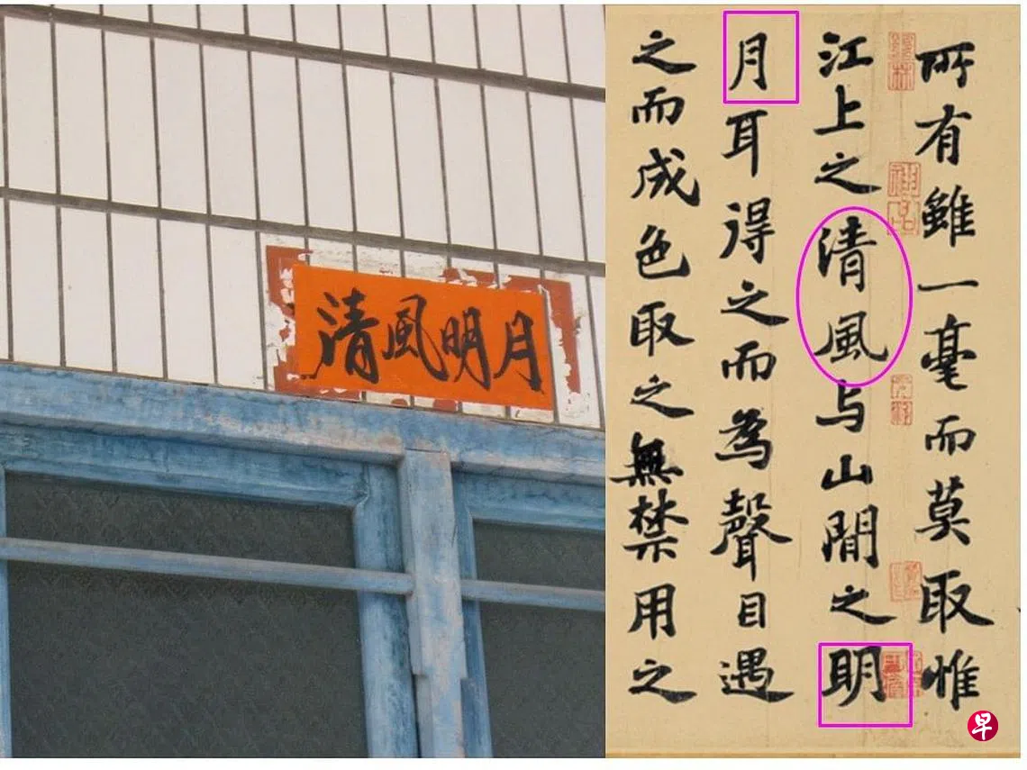 斑驳的木窗棂,褪脱的蓝漆被尘土覆盖成灰色。窗上的白瓷砖墙面,贴了一张红纸——“清风明月”。红纸底是被撕去的旧红纸残迹,之前,这块地方写的是什么呢?