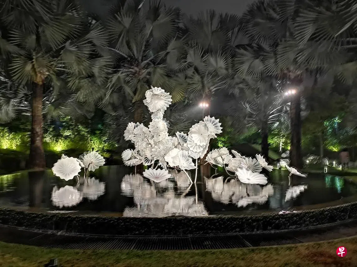 一回头,丛林深处有个池塘,烟雨淅沥,波光涟漪,池中琉璃荷叶高低错落,一派东方语境。白天,大型琉璃艺术品融合在周围的绿意花草中,纯真明媚,若能种上荷花,蓝紫睡莲粉色花苞那恐怕连莫奈也要醒来再来一幅“印象南洋”!微雨的夜晚,背景黑色,池水渐暗变成La La Land的爵士舞台,于是“有位佳人,在水一方”。纯粹的层次丰富的黑白配合着微雨,卓越的美国琉璃大师在有意无意间,在南洋热带花园里立体创作了一幅中国水墨,身段柔软,神秘独立。那是苏轼的“起舞弄清影,何似在人间”,那是《药师经》里“愿我来世得菩提时,身如琉璃,内外明澈。”