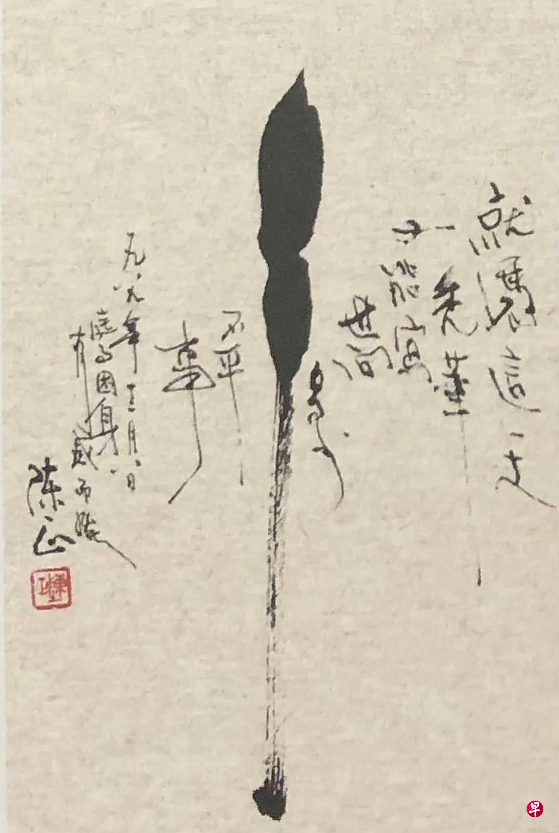 阅读陈正刚出版的《正书雧》《我·报馆·戏墨》这篇序文陈述了他与报社生涯、习书戏墨的欢喜因缘。序文一侧附着他的一幅字,我以为是陈正本性与书法现代感的交织体现。作品的正中主体,是浓墨由上一竖拉下形成的一管毛笔造型,从右至左,铺陈着参差错落的两句话:“就凭这一支秃笔,又能写世间多少不平事”,落款有“庭事困身有感而发”,笔端墨痕透出的,是生活碰撞下的真性情。